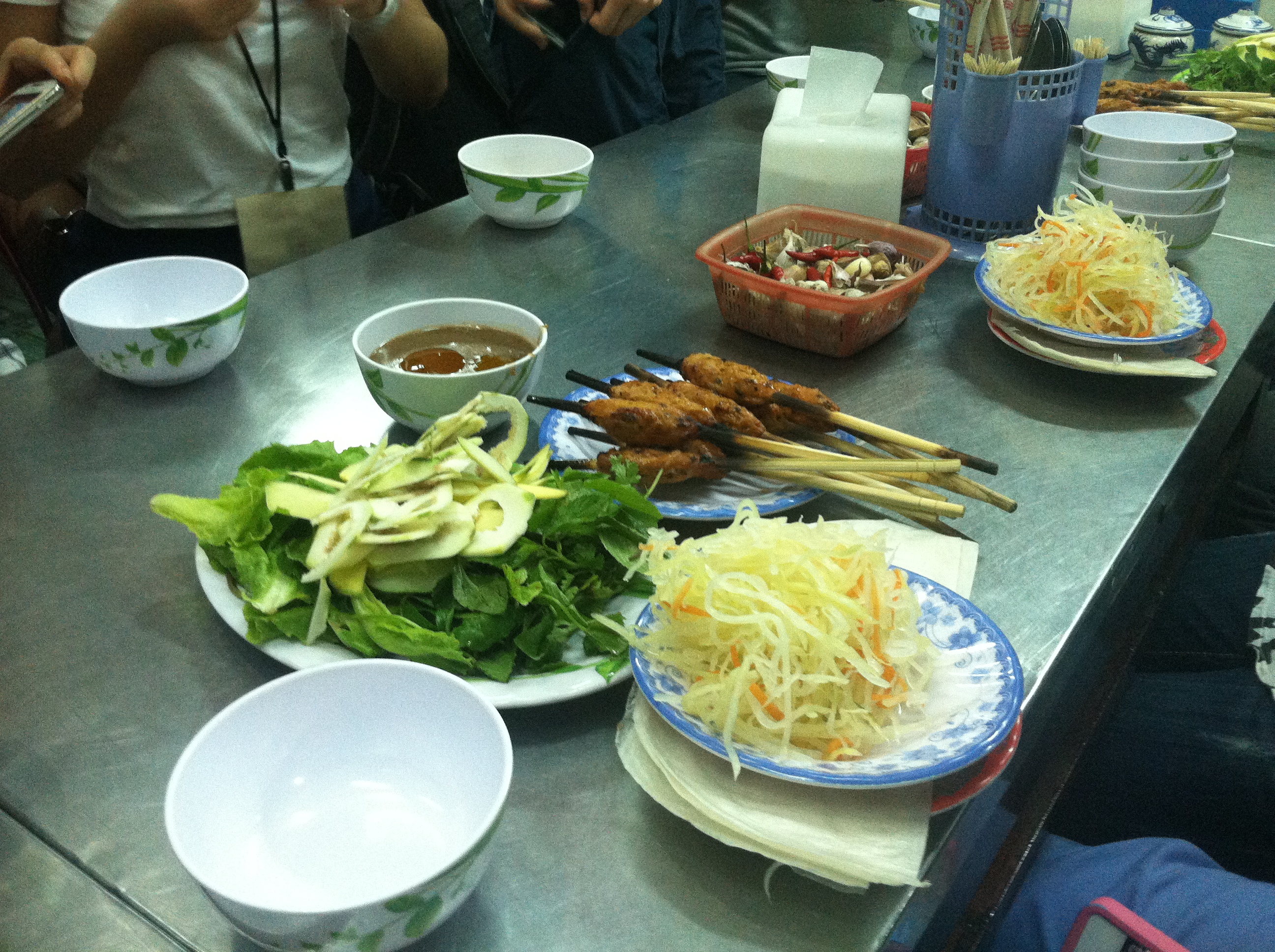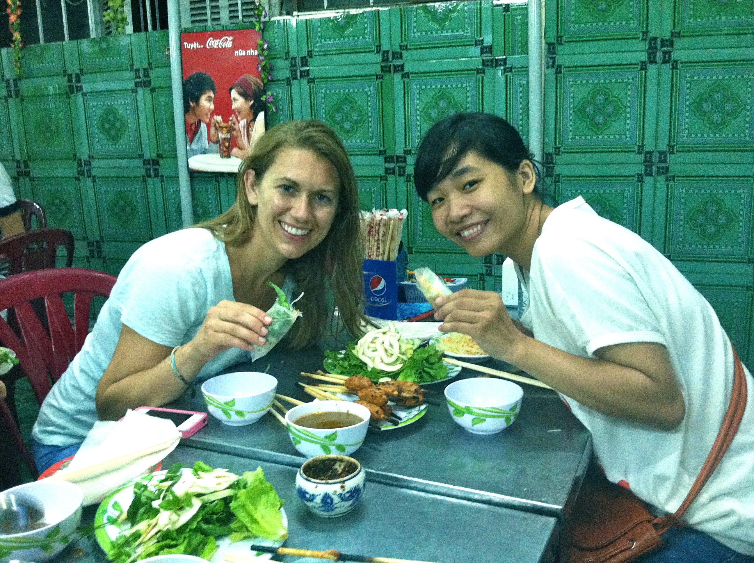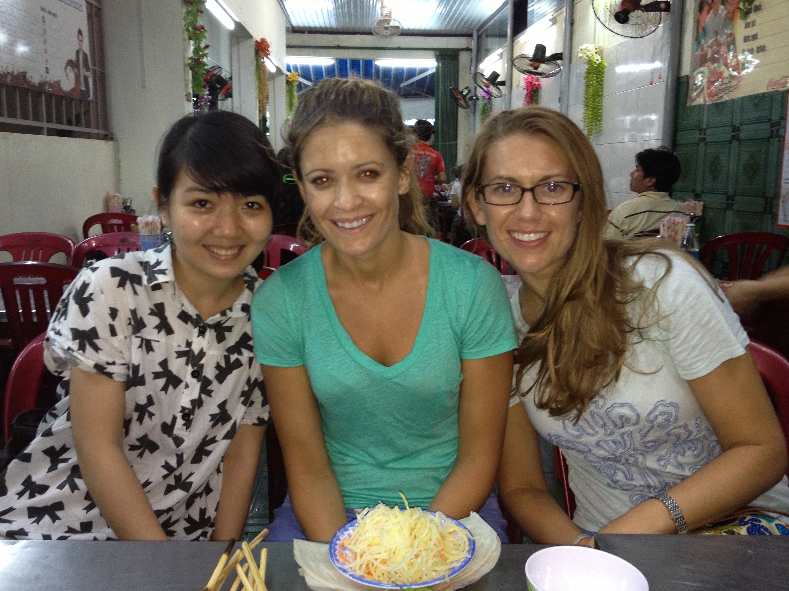 It’s really hard to believe that the clinical part of the trip has come to an end. This may be a good thing considering Kit thinks she may have Dengue Fever, or heat exhaustion and a stomach not meant for Vietnamese food. Last night, we took our translators out to dinner. We went to a place called Tai Pho (which is not Thai food), and had a family style meal of spring rolls with pork and banh quioe (kway, and totally spelled incorrectly), which is a crepe with bean sprouts, pork, shrimp and lettuce. They picked the restaurant and told us this is a place they come to as a group. The food was yummy and we were stuffed by the time we walked out. However, out translators did insist that they take us out for dessert that consisted of layers of sweet bean, +/- corn, +/- banana all served with ice and coconut milk. Sounds crazy, but actually really sweet and delicious, like a parfait. The whole evening was a lot of fun and it was wonderful to spend time outside of clinic with everyone we have been working with, go to their favorite restaurants and share their favorite meals.