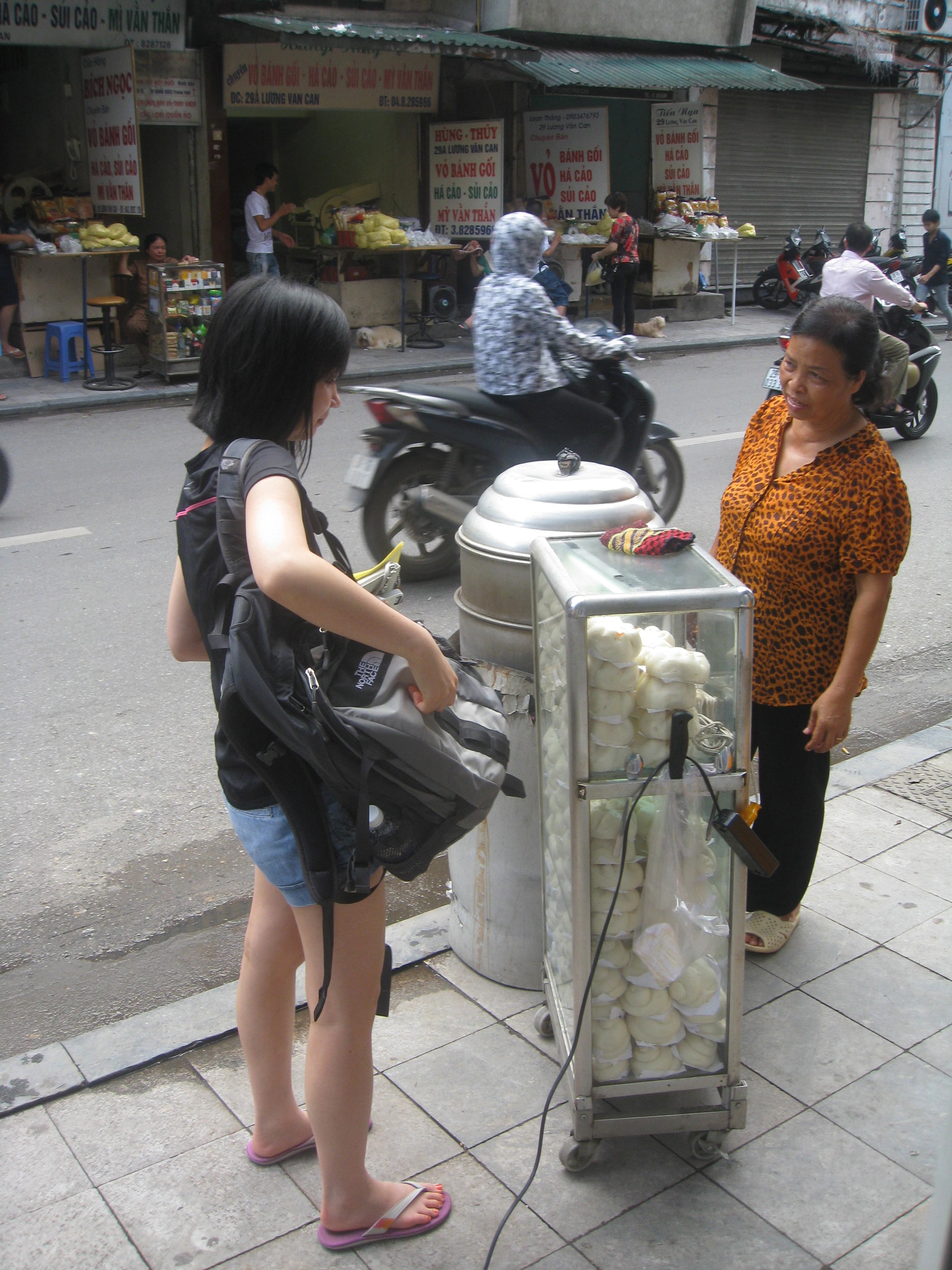 After arriving in Hanoi, we caught a taxi for the 45-minute trip to the tourism office where we were to meet up with the tour group. Realized quickly that the reason this is a 45 minute drive is that the average speed is 15 mph. This is largely due to the fact that there are NO traffic rules! Somehow we did make it to the tour office by 8:30, and even had time to grab a pork sausage Bun from the street vendor: