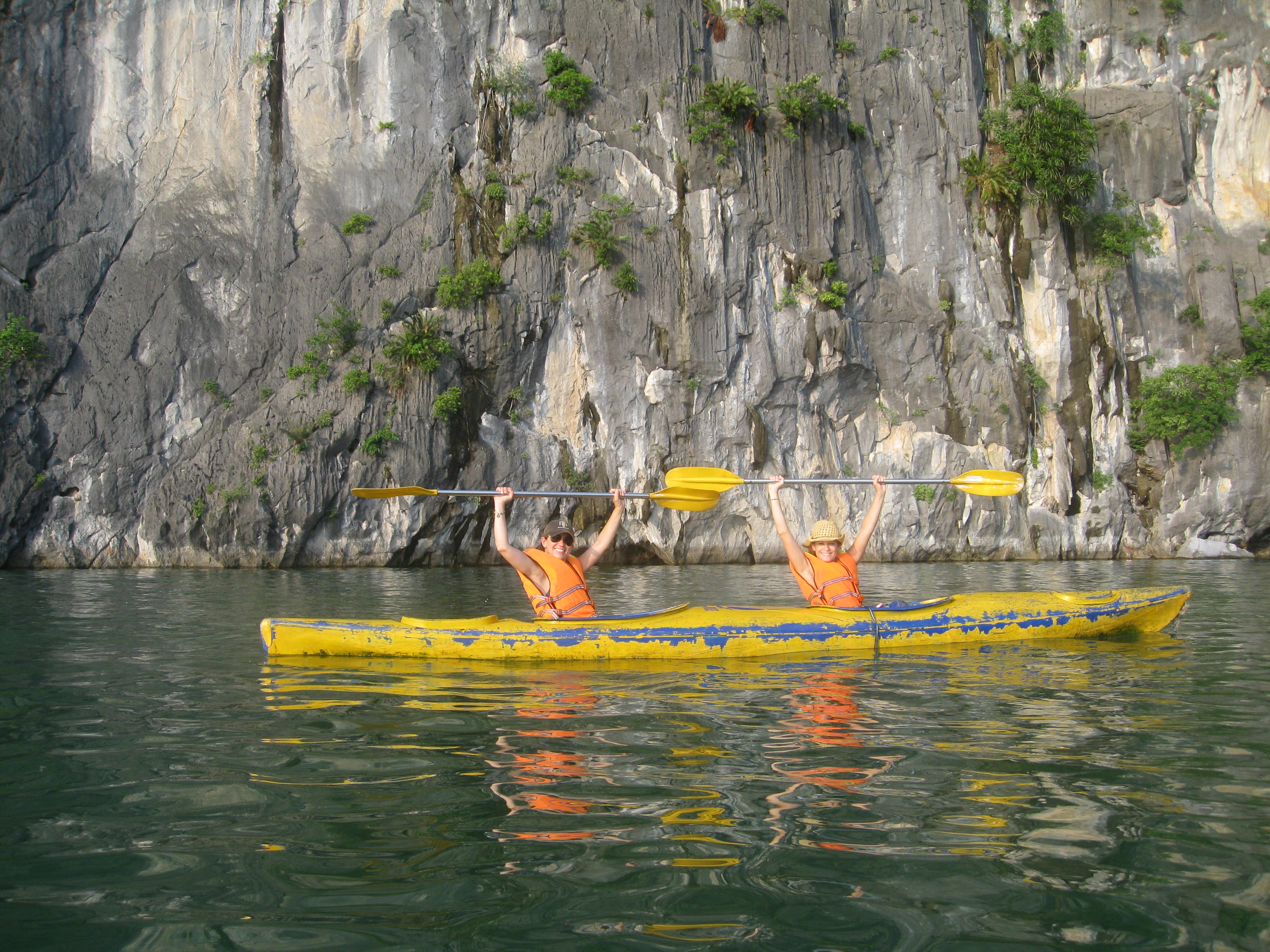 We started off with lunch, which happened to be a 7-course meal of fruit, vegetables, and fish. We were fed constantly and well – the food was amazing & fresh. We then took the boat to our first stop: a big cave to “hike” through. Now, in New Zealand, easy beach walk translated to 9-hour arduous mountain trek. Here “hike” meant a long stroll through a cave with 900 of your closest friends. Although stalagmites and stalactites are cool, it is not something recommended for those with claustrophobia. We then cruised over to a floating fishing village and took kayaks through the fishing village. This part of the day was way too short, or maybe it was the stopping every 2 minutes for another photo, but whichever way, wish we spent more time kayaking. This part was only complicated when Leann and Thao Linh never returned. 30 minutes after everyone had returned, they finally paddled up. Glad we were not going to have to explain a disappearance at sea to the rest of the team!