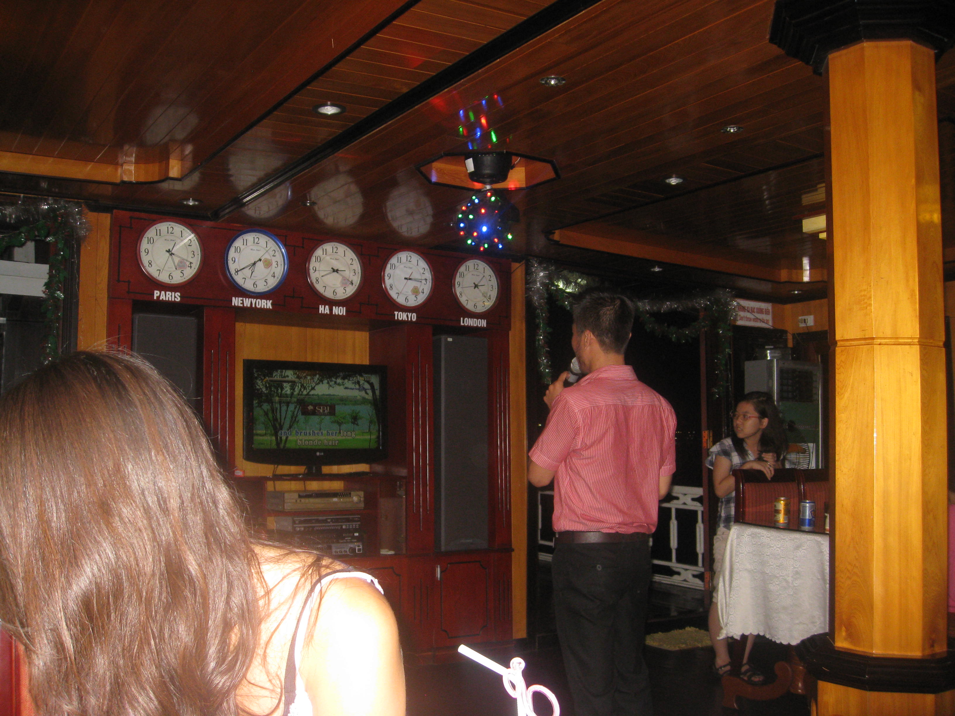 So, we have been out in villages, we have eaten local food with families, and even had massages. But it was not until the night on the boat that we had the true Vietnamese nightlife experience. Yes, I am talking about karaoke. Now, The Le had mentioned earlier in the week about karaoke, but I had not really paid attention to the importance of this. Looking back, there have been quite a few karaoke bars in each city – Funny Karaoke, VIP Karaoke, Karaoke Club 86 to name a few. The captain announced after dinner that it was time for the evening’s entertainment – karaoke all night long. He and his crew started off karaoke with an American song and then a Vietnamese song, then the Aussie couple took over followed by the French Canadians with a Backstreet Boys song. The captain then came to us four to really get the party going, and enthusiastically kept us up at the mike and sang along with us to Neil Diamond, Bon Jovi, Garth Brooks, Backstreet Boys (Kit), and Britney Spears. Don’t worry though – neither of us are quitting our day job, and since Leann has this recorded, neither one of us can ever run for public office. It was all topped off by a rather uncoordinated but enthusiastic version of “Time Warp” from Rocky Horror picture show.