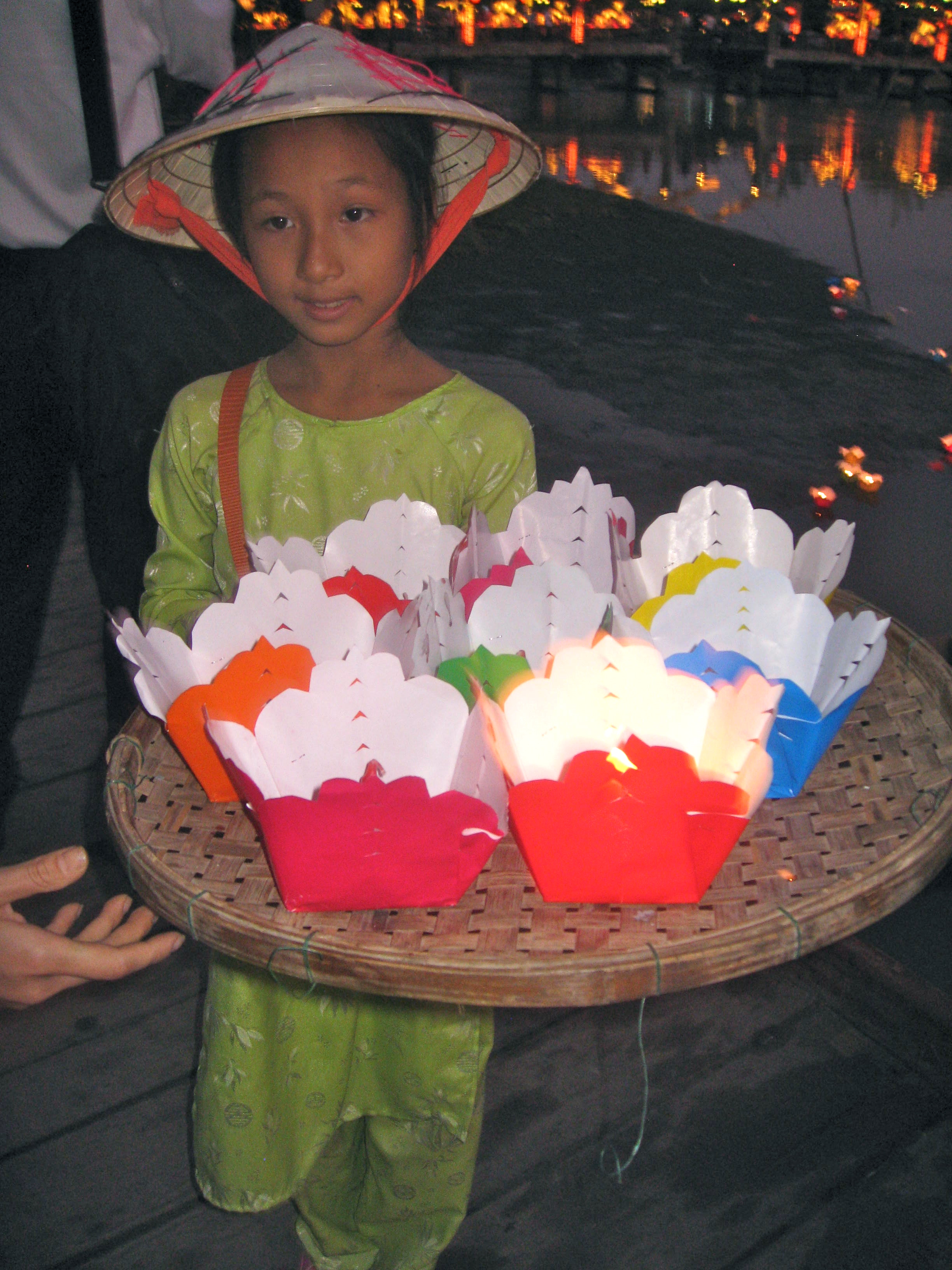 After dinner, we discovered that at night, the children sell candles to float down the river. I am sure that this is for the tourists, but the effect was stunning! Hoi An: definitely a must!